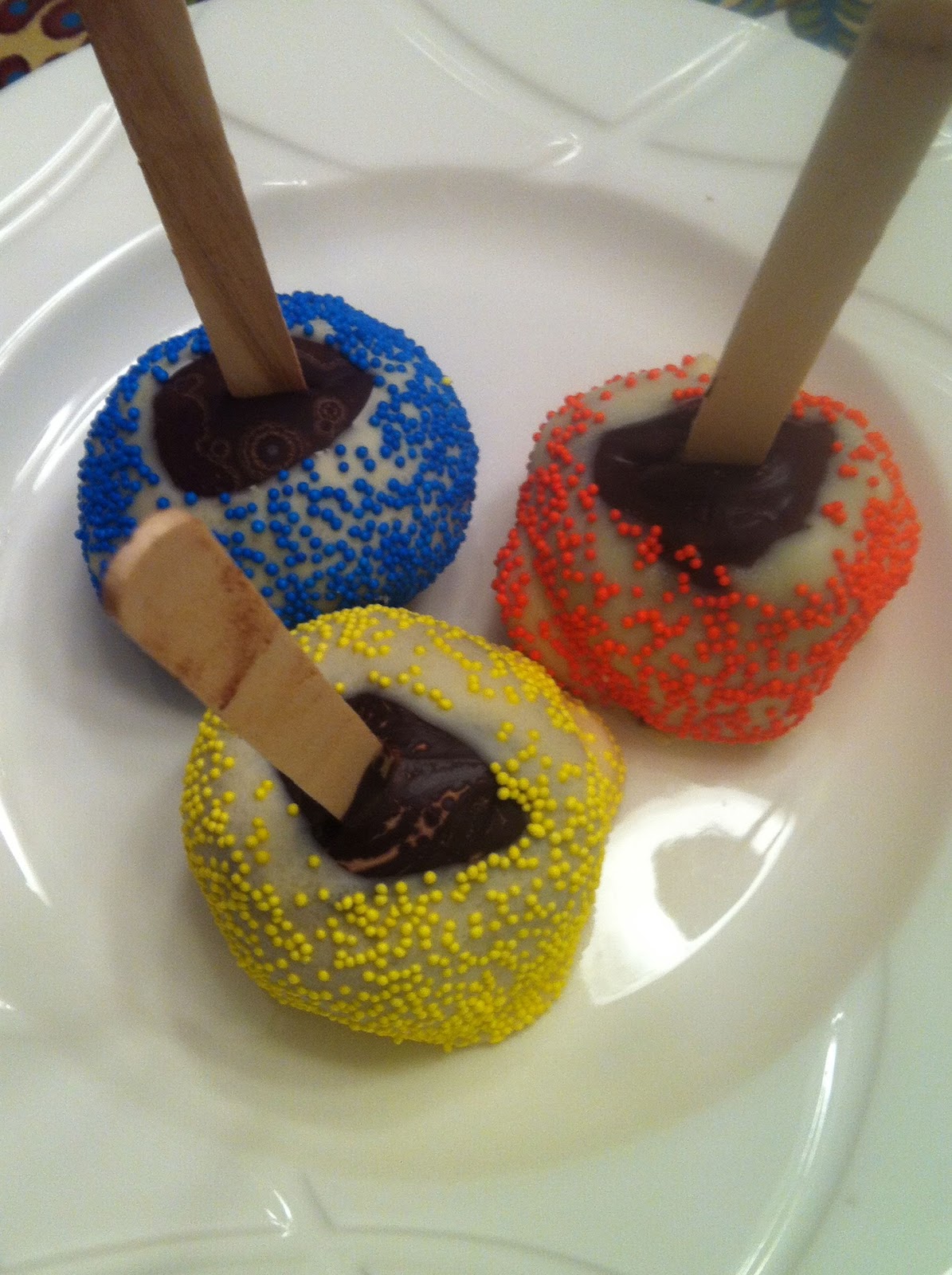 7. Dip into sprinkles. (Hint: Place sprinkles in cupcake liners for the sprinkles or small ramekin.)